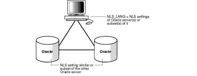 In a heterogeneous environment, the NLS settings of the client, the transparent gateway, and the non-Oracle data source should be either the same or a subset of the Oracle database server NLS character set as illustrated in Figure 1-8. Transparent gateways have full NLS support.